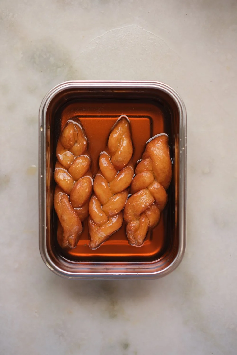 Gooi in ’n houer en sit in die yskas vir 4 tot 6 uur, of oornag. Vir die beste resultate, sit die houer stroop in ’n bak ys terwyl jy braai.